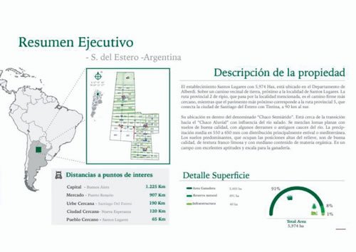 RG Crende Bienes Raíces ofrece en venta: 5974 Ha campo con excelentes aptitudes y escala para ganadería en Santiago del Estero – Localidad: SANTIAGO DEL ESTERO – SANTIAGO DEL ESTERO – SANTIAGO DEL ESTERO – Descripción: El establecimiento Santos Lugares con 5,974 Has, está ubicado en el Departamento de Alberdi. Sobre un camino vecinal de tierra, próximo a la localidad de Santos Lugares. La ruta provincial 2 de ripio, que pasa por la localidad mencionada, es el camino firme más cercano, mientras que el pavimento más próximo corresponde a la ruta provincial 5, que conecta la ciudad de Santiago del Estero con Tintina, a 90 km al sur.